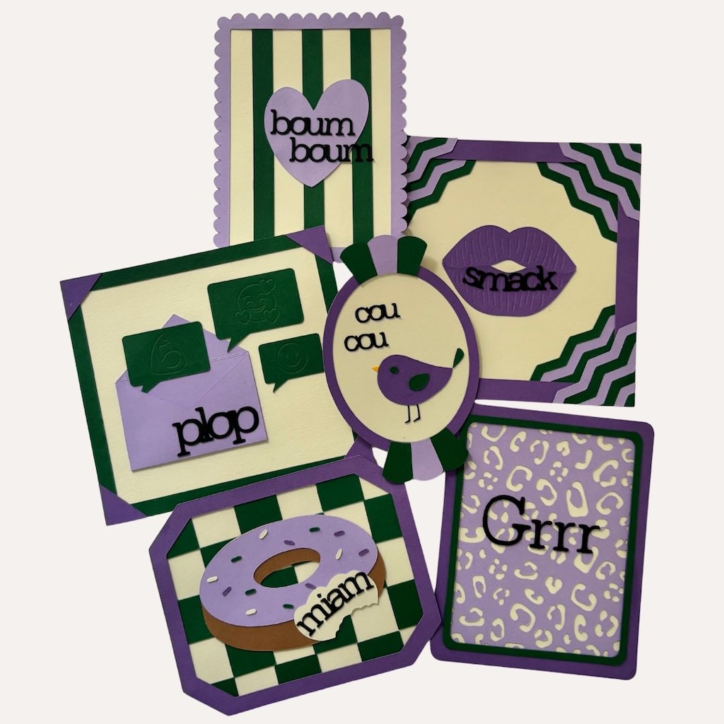 Donnez du peps à votre décoration avec ces mini-cadres décoratifs à messages originaux ! Chaque cadre met en scène une onomatopée pleine de caractère dans un univers graphique coloré aux tons violet et vert.