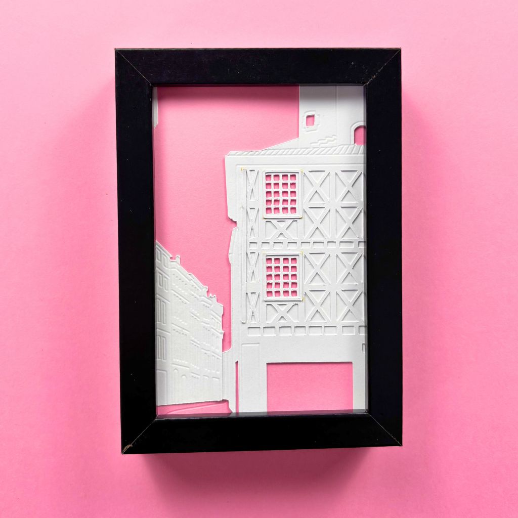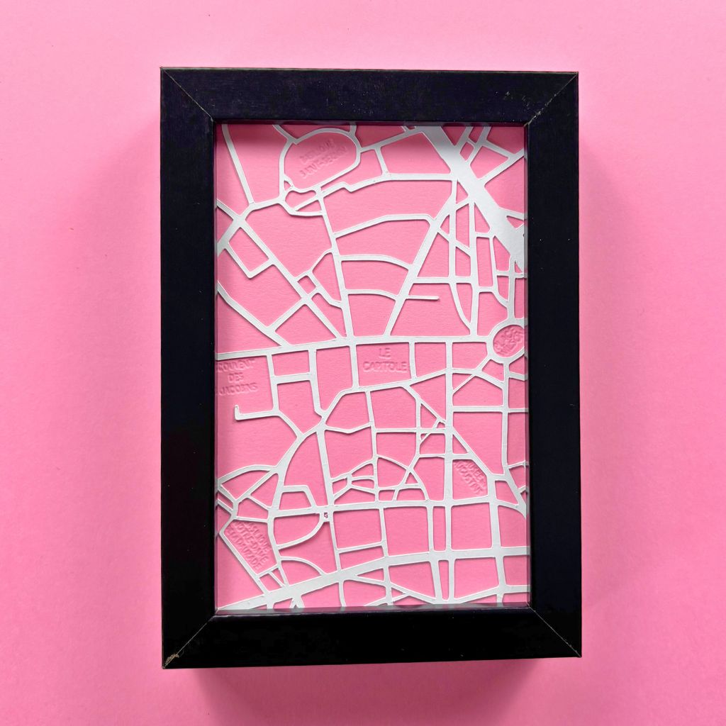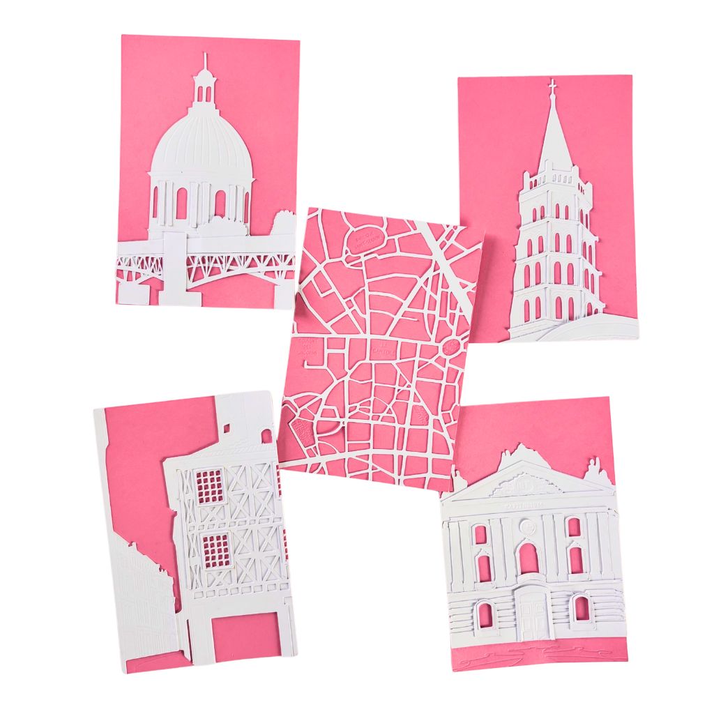 Ce kit créatif en papier découpé sur Toulouse vous invite à recréer des vues emblématiques de la Ville Rose, à votre rythme, guidé pas à pas par une vidéo d’accompagnement. Superposez les pièces prédécoupées en blanc sur fond rose vif pour faire surgir toute l’architecture toulousaine de vos mains.