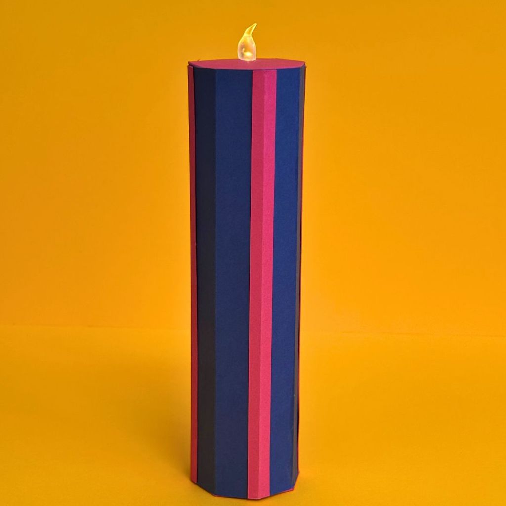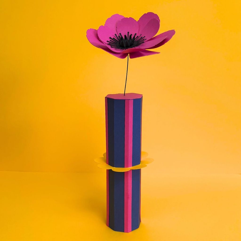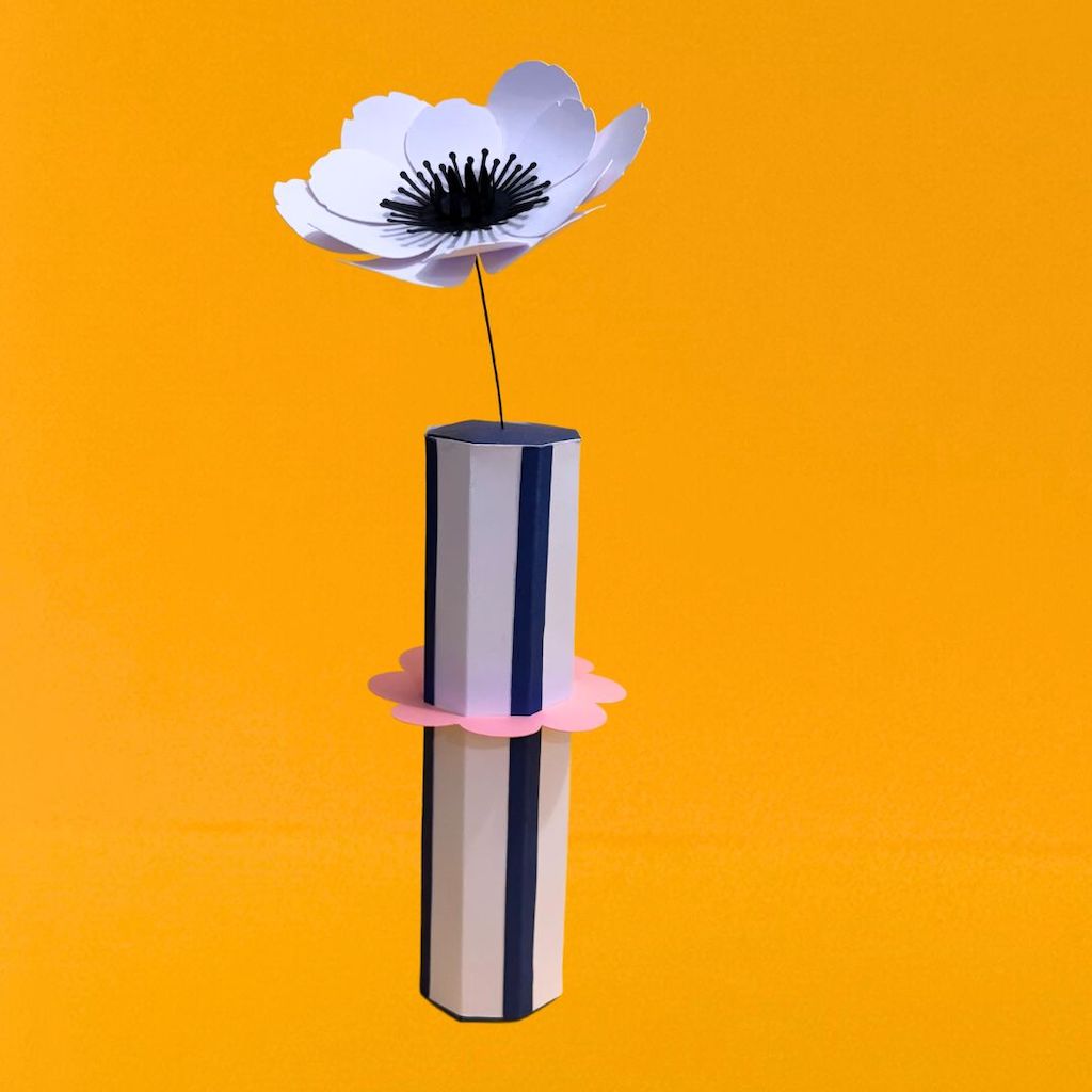D’un côté, vous avez une bougie LED qui vient s’insérer sur le dessus de cette colonne hexagonale pour créer un bougeoir moderne. Enlevez-la, retournez cette dernière et plantez une grande anémone en papier en son centre pour la transformer en soliflore.